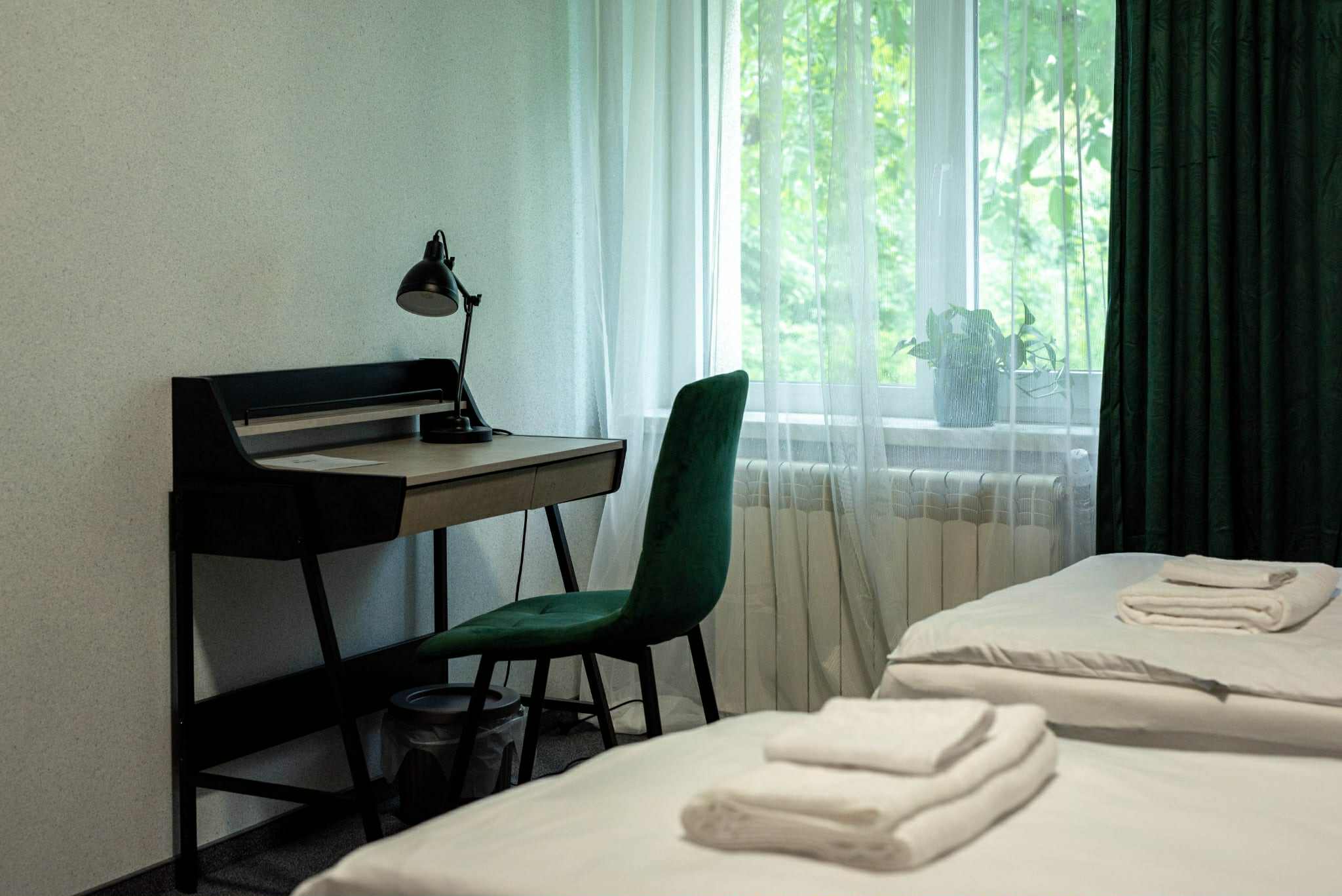 ma prywatną łazienkę, wygodne łóżka, szafę i biurko. Pokoje są